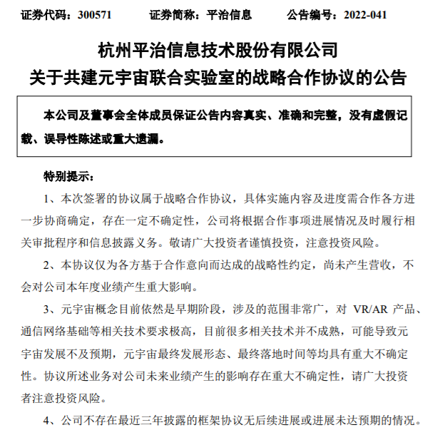 3月17日,據平治信息公告,于近日與聯通在線信息科技有限公司、新華網股份有限公司簽署了《關于共建元宇宙聯合實驗室的戰略合作協議》,計劃成立元宇宙聯合實驗室,充分發揮各自領域的人才、技術及市場等資源優勢,聯合推動元宇宙產業制度建設和產業落地。