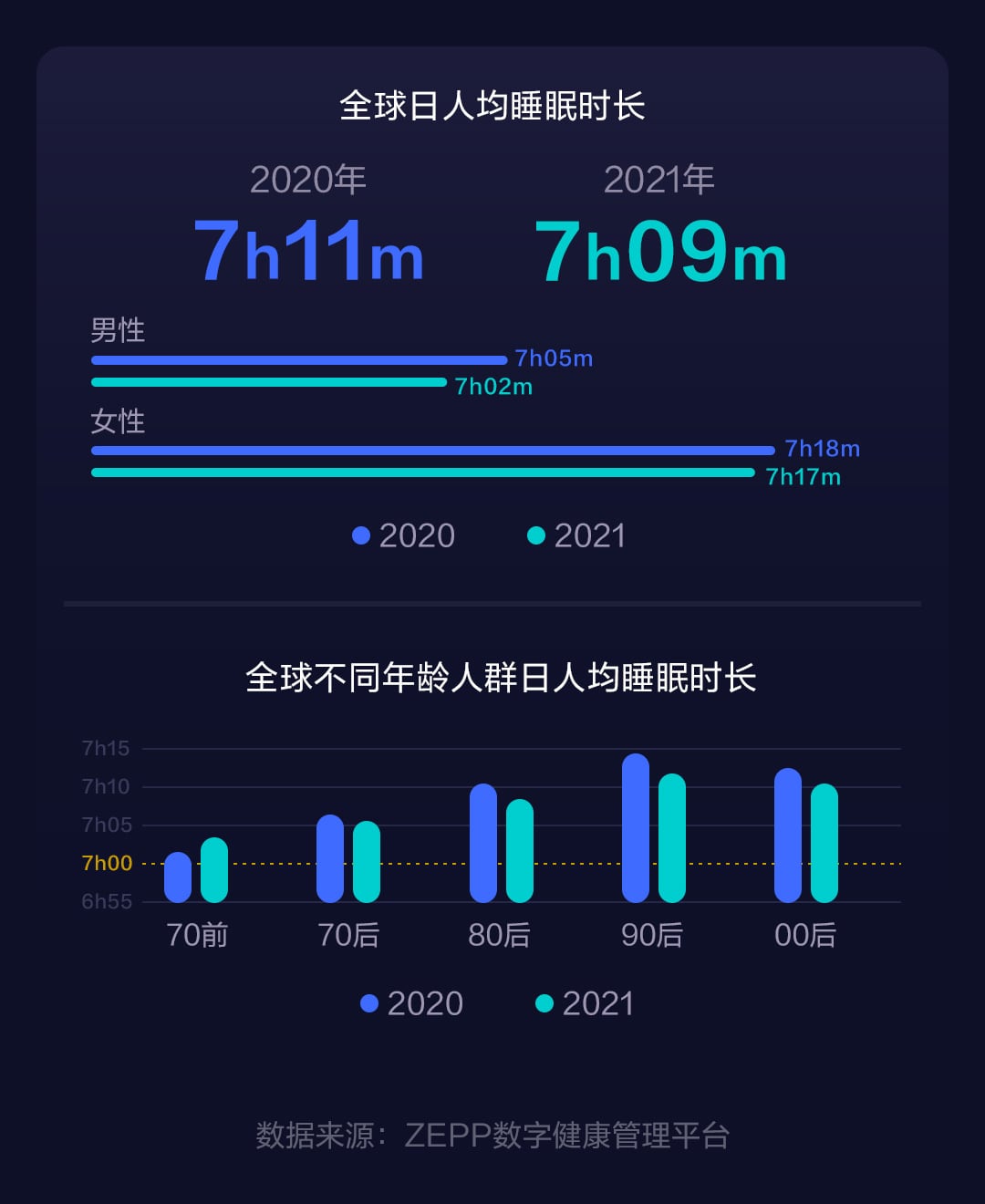 數據顯示,在本次白皮書覆蓋到的國家和地區中,2021年全球平均每人每天睡眠時長為7小時9分鐘,相較2020年減少了2分鐘。男性睡眠時長少于女性,90后人群睡眠時間最長,70前夜間睡眠時長最少,但各年代段中只有70前人群2021年日人均睡眠時長有所增加。