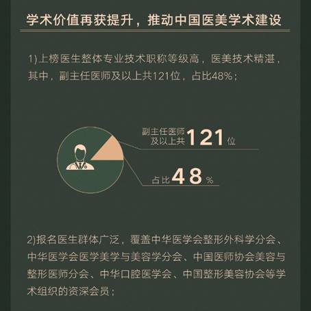 據統計,本次評選報名總人數相比上期增長超六成,其中公立機構醫生參與度高漲,報名人數暴增585.19%;報名的醫生群體也更加廣泛,覆蓋中國醫師協會美容與整形醫師分會、中華醫學會整形外科分會、中華醫學會醫學美學與美容學分會、中國整形美容協會的資深會員、中華口腔醫學會等學術組織;上榜醫生整體專業技術職稱等級高,其中,副主任醫師及以上職稱共121位,占上榜總人數比例高達48%。