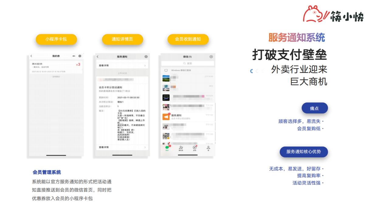 第二,此次筷小快借力流量基數(shù)大,滲透多場景的微信。對餐飲商家而言,筷小快與美團、餓了么這樣利用公域流量外賣平臺不同,它助力商家做的是私域流量的基建。簡而言之,商家想要獲得流量,獲得曝光,不用再支付給外賣平臺高額的廣告費、運營費,而完全可以自己來策劃營銷活動,或者通過推送自定義的無痕廣告、服務通知等進行裂變、引流,既節(jié)省了不少的推廣開銷,還能實現(xiàn)更多老帶新的新流量拓展,增加客戶粘性,輕松獲取到一大批流量。