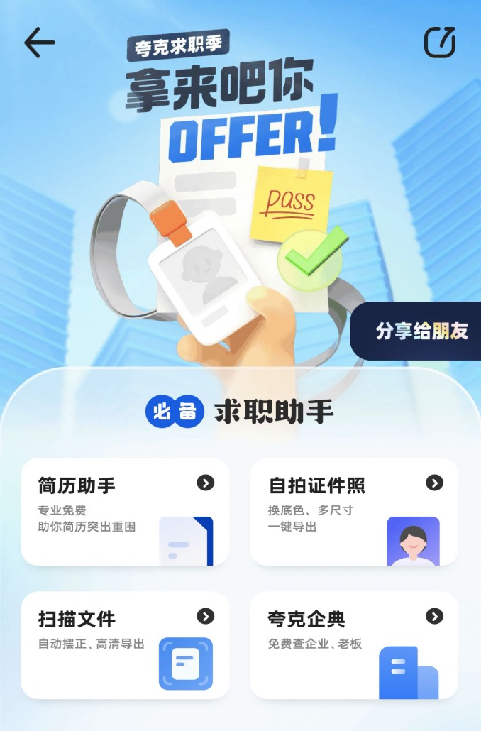 為此,夸克App上線了聚合多款智能工具、豐富內容資源的求職季專題頻道。提供海量免費簡歷模板與求職攻略的簡歷助手,可換底色、多尺寸的自拍證件照,支持高清導出的掃描文件,成為年輕人喜愛的求職神器。