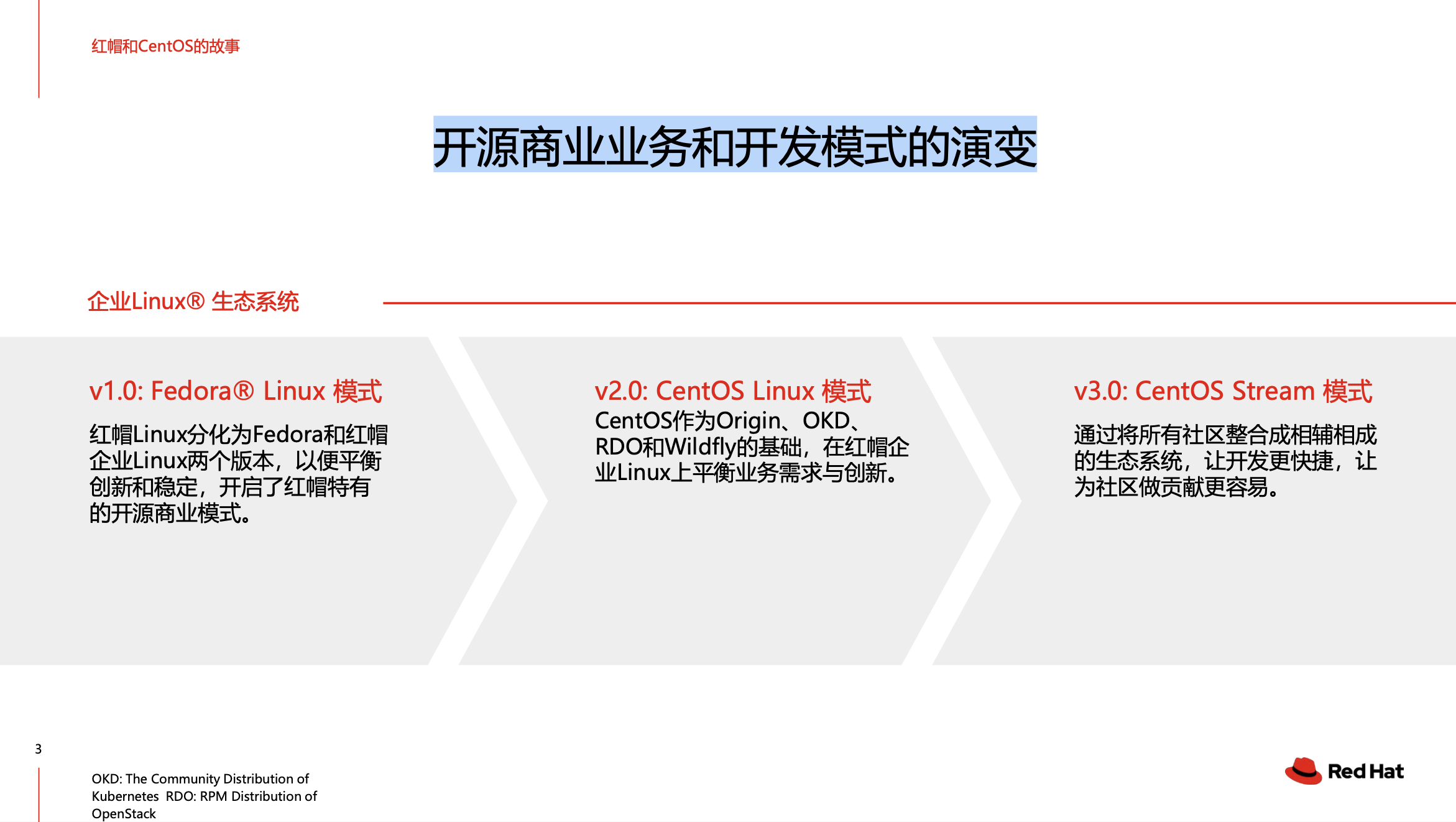 曹衡康指出,紅帽開源商業(yè)業(yè)務(wù)和開發(fā)模式的演變,共分為三個階段。其中v1.0階段為Fedora Linux模式,這一階段紅帽Linux分化為Fedora和紅帽企業(yè)Linux兩個版本,以便平衡創(chuàng)新和穩(wěn)定,開啟了紅帽特有的開源商業(yè)模式。v2.0階段的代表,則是紅帽推出了CentOS Linux模式,CentOS作為Origin、OKD、RDO和Wildfly的基礎(chǔ),在紅帽企業(yè)Linux上平衡了業(yè)務(wù)需求與創(chuàng)新。CentOS Linux是紅帽在企業(yè)級RHEL版本當(dāng)中所衍生出來的社區(qū)版本。