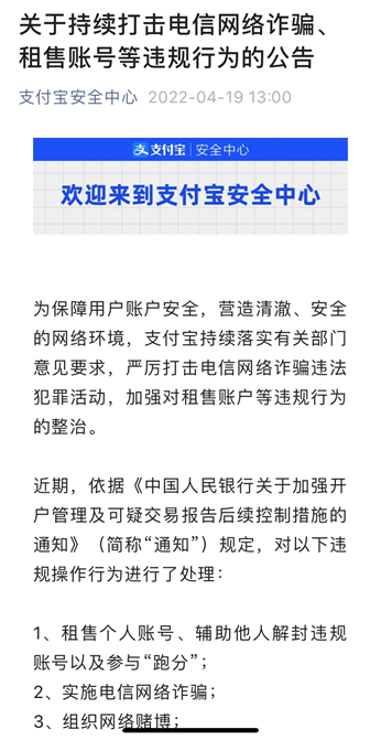 除嚴厲打擊電信網絡詐騙外,支付寶還依據《中國人民銀行關于加強開戶管理及可疑交易報告后續控制措施的通知》,公布了對租售個人賬號、輔助他人解封違規賬號、參與“跑分”、組織網絡賭博、從事虛擬幣交易等違規操作的處理舉措。