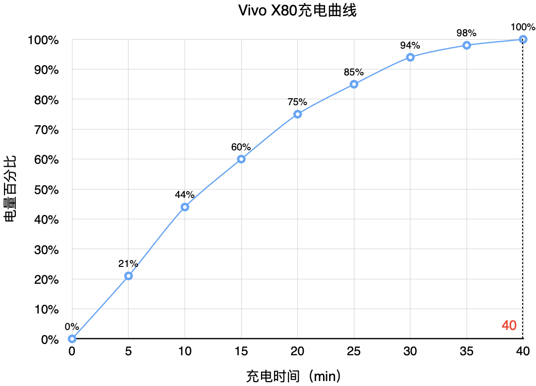 實(shí)測使用原裝充電器為手機(jī)充電,前15分鐘即可為手機(jī)充電60%,0-100%共耗時(shí)40分鐘。