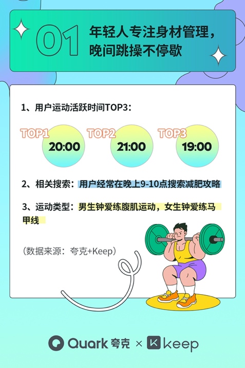 夜晚是運動達人們的黃金時刻,大家紛紛化身專業選手,在家開啟揮汗如雨的運動模式,其中20點、21點、19點分別是用戶運動活躍排名前三的時間點。在鍛煉的同時,年輕人也不忘學習如何快速掉秤,經常在晚上9-10點搜索減肥攻略,希望通過科學的方式健康減脂。