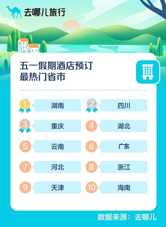受本地游帶動,部分大城市周邊酒店節假日火爆,去哪兒大數據顯示,從目前的酒店預訂量中看,此次五一期間最熱門的城市為,湖南、四川、重慶、湖北、云南、廣東、河北、浙江、天津、海南。川渝、云貴地區酒店預訂量環比前一周漲幅近兩倍。從五一酒店預訂熱門商圈中看,重慶、云南、廣東地區熱門酒店較多。