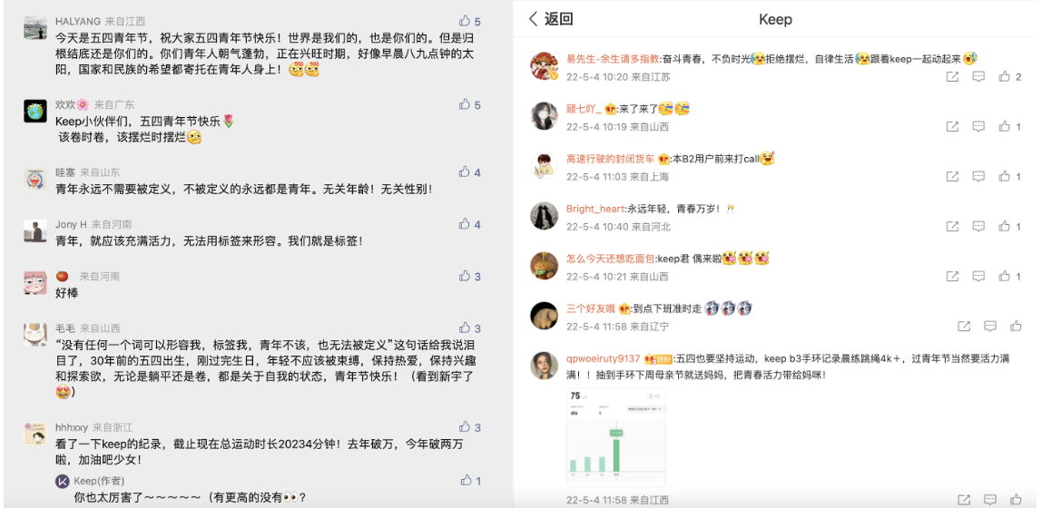 5月4日,Keep官方發布了一支以電腦錄屏為載體的實驗性影視作品《別叫我青年》,全片以實習生視角,記錄對青年群體的洞察和理解,表達了“年輕人不該被定義,但你永遠可以相信年輕人”的青年態度,并借由Keep各部門實習生的親身演繹,傳遞了Keep作為一家年輕化品牌,通過運動精神鏈接年輕人、信任年輕人并尋求靈魂共鳴的文化價值取向。該視頻上線后,在知乎、B站和微博等多個社交媒體平臺引發討論,包括來自中國傳媒大學、清北校園等多所高校的喊話和點贊,讓Keep真正成為這波青年話題的焦點。