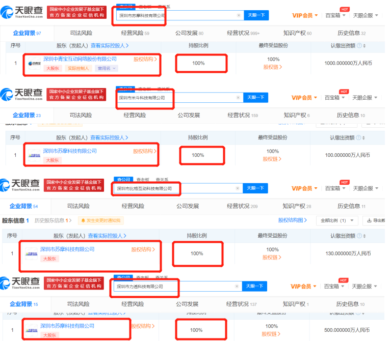 天眼查APP顯示,上述四家企業(yè)均由中青寶直接或間接持股,持股比例為100%。