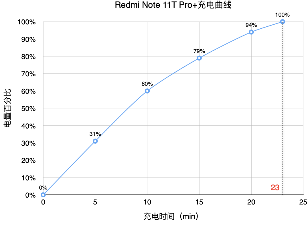 而采用包裝內(nèi)搭的120W原裝充電套裝為Redmi Note 11T Pro+充電,充電初期峰值功率可以接近100W,10分鐘即可充電60%,1-100%僅需要23分鐘。