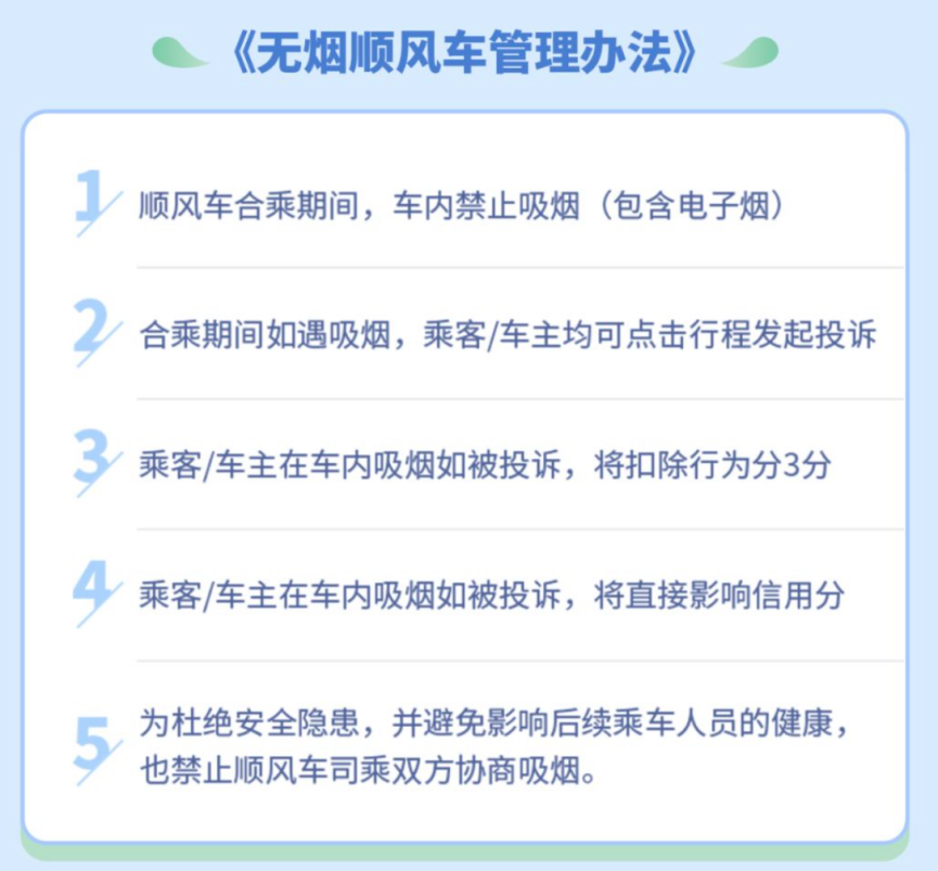 2019年12月,嘀嗒出行推出《嘀嗒無煙順風車管理辦法》。通過「無煙車」、「車內不吸煙」等合乘好評標簽,對車主和乘客保持車內空氣清新行為進行鼓勵;通過投訴機制、行為分和信用分等多個維度,約束車內吸煙行為。