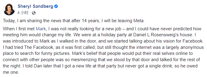 可以說桑德伯格的能力是足以匹配扎克伯格對其極高的評價。對于桑德伯格的離職,扎克伯格也表示:“接下來不能和Sheryl親密工作了,我感到非常悲傷。但是更重要的是,我感謝她為了打造今天的Meta所付出的一切。她為我、為我們的社區、為世界做了很多事情。我們都因為她的復出而變得更好了?!?/p>