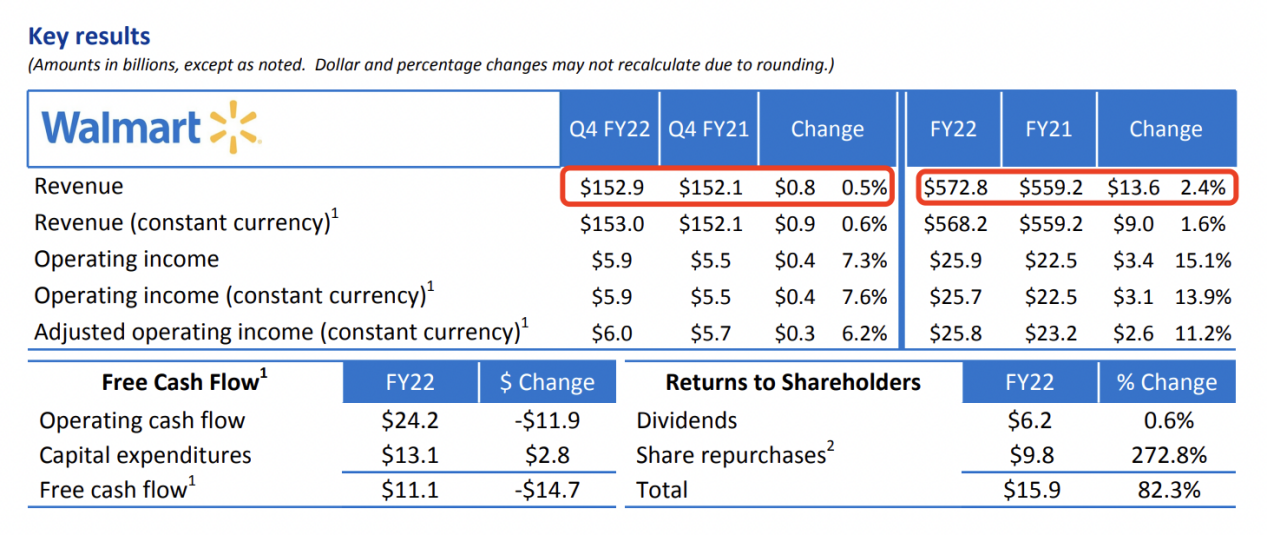 2022年2月17日,沃爾瑪官方發(fā)布了2021年第四季度財(cái)報(bào),同時(shí)匯總了2021年的全年財(cái)報(bào)。2021年Q4沃爾瑪營(yíng)收達(dá)到1529億美元,同比增長(zhǎng)0.5%;沃爾瑪2021年總營(yíng)收達(dá)到5728億美元,同比增長(zhǎng)2.4%;凈利潤(rùn)為136.76億美元,同比增長(zhǎng)1.2%。展望2023財(cái)年,沃爾瑪預(yù)計(jì)營(yíng)收將達(dá)到5884億美元。