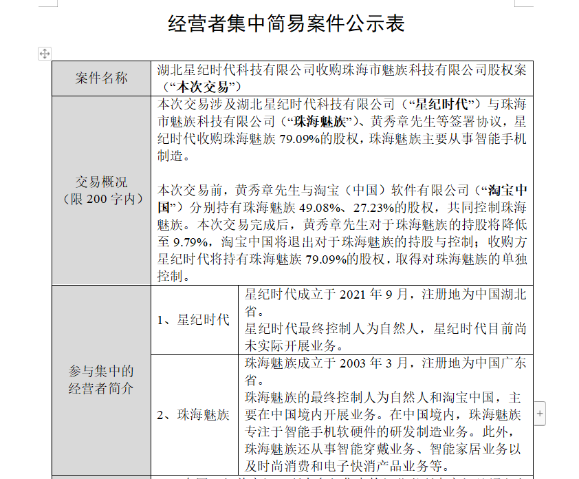 今日,國家市場監督管理總局信息顯示正式披露,本次交易涉及湖北星紀時代科技有限公司 (“星紀時代”) 與珠海 市魅族科技有限公司 (“珠海魅族”)、 黃秀章先生等簽署協議,星紀時代收購珠海魅族 79.09% 的股權,珠海魅族主要從事智能手機制造。