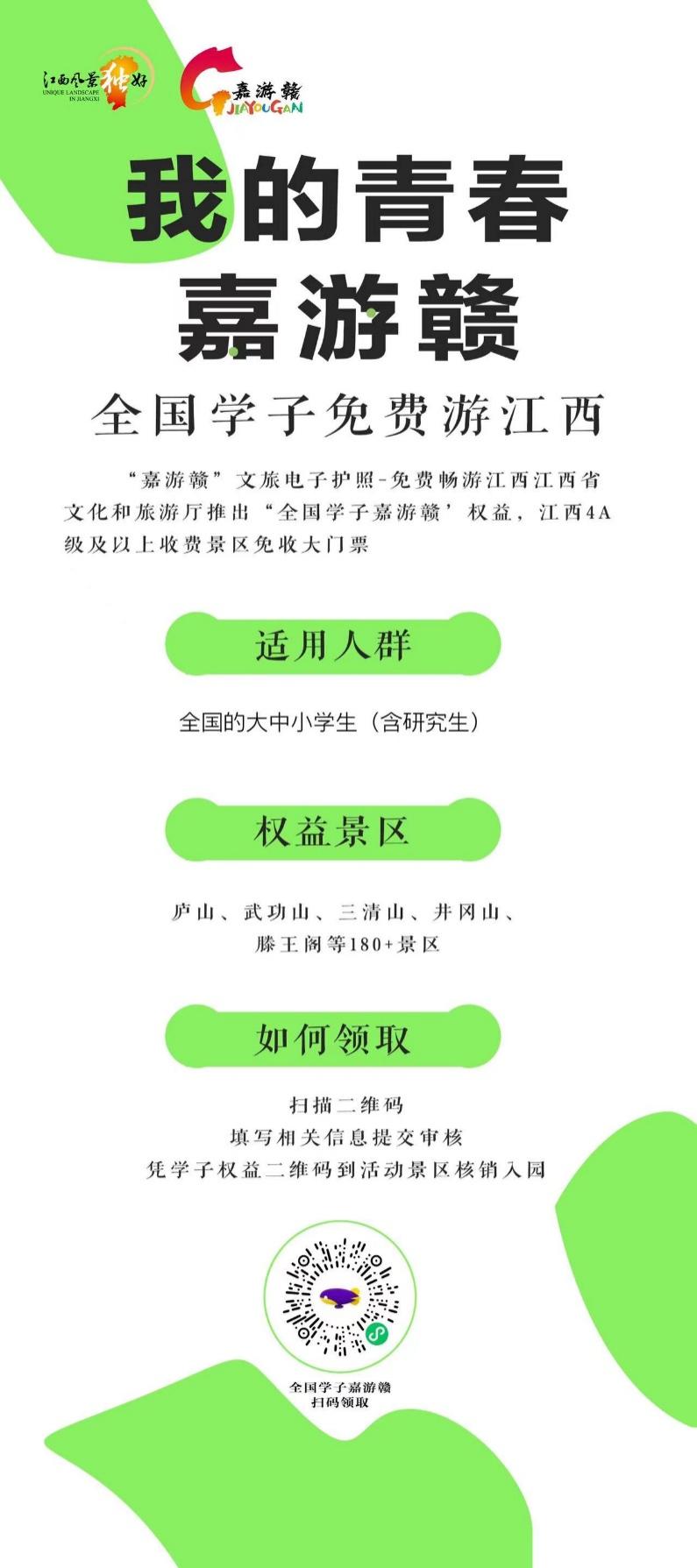 活動包含了派發“嘉游贛”文旅護照、免費開盲盒、趣味打卡等多種形式,吸引了眾多學生的關注和參與。不少學生紛紛表示暑期將帶著同學或家人去江西旅游。作為此次活動的重磅福利,全國的大中小學生(含研究生)均可免費申領“嘉游贛”文旅電子護照,獲取“嘉游贛”學子權益,即可免大門票游江西省內4A級及以上收費旅游景區,包括廬山、武功山、三清山、井岡山、滕王閣等180余家著名景區。該權益可持續到2023年2月28日(含),全國學生都可以在此期間享受到這項實惠。