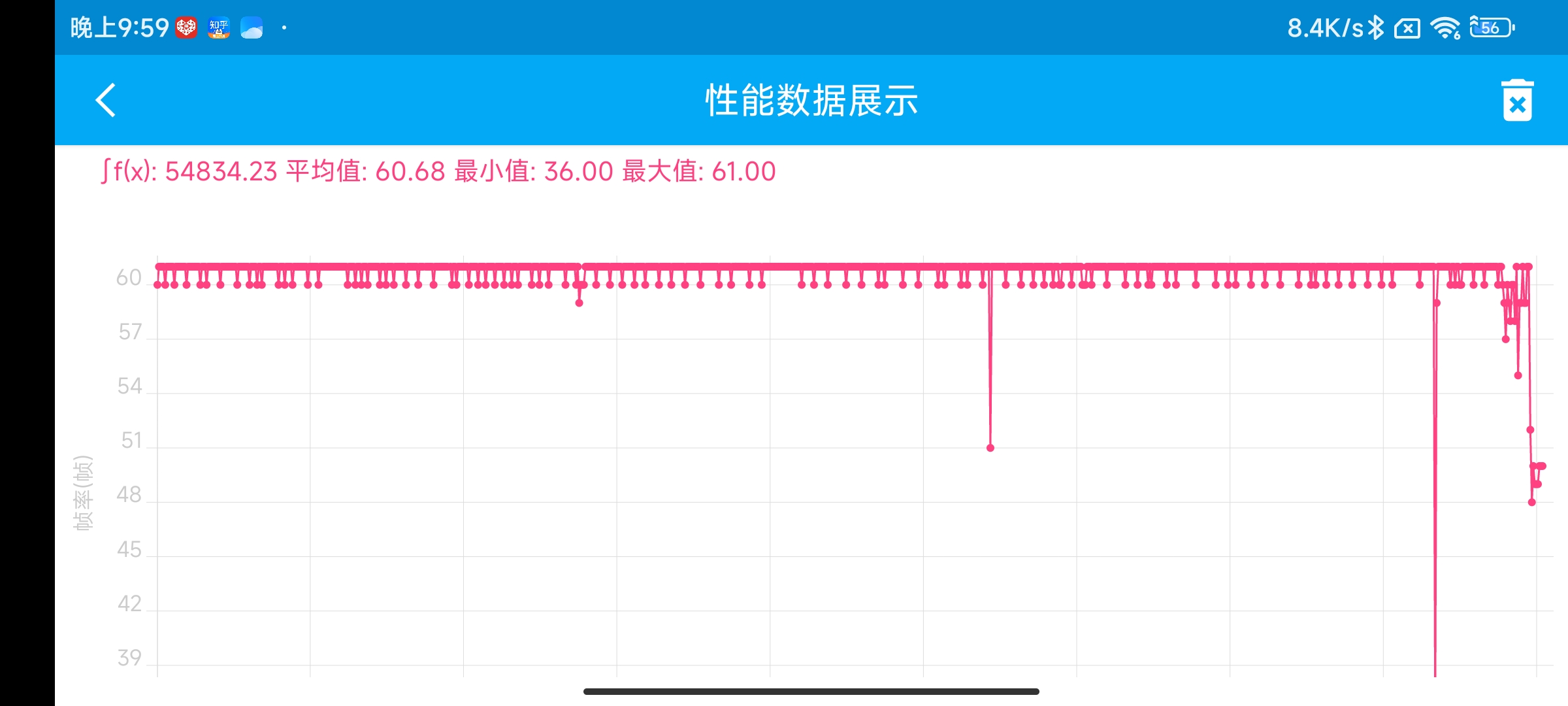 在測(cè)試開始時(shí),手機(jī)背部最高溫度為30.1°C,在15分鐘的測(cè)試后,手機(jī)表面最高溫度則僅為33°C左右。而強(qiáng)勁的制冷效率,也讓處理器不會(huì)出現(xiàn)降頻,游戲全程平均幀率達(dá)到了60.68fps,且并未出現(xiàn)明顯的幀率波動(dòng)。