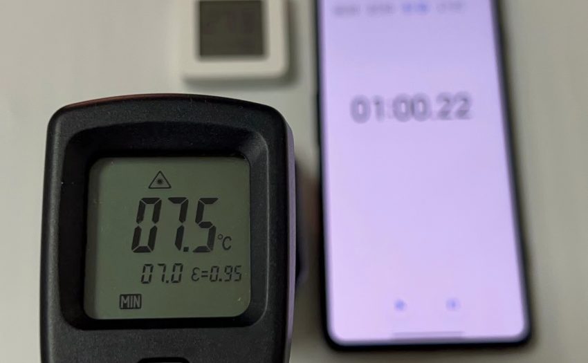 為了測(cè)試黑鯊冰封制冷背夾3 專業(yè)版的空載制冷能力,我們?cè)谑覝?7.5°C的條件下開啟測(cè)試,1分鐘時(shí)間內(nèi),制冷背夾的散熱片表面溫度從31.3°C(背夾插電以后表面溫度會(huì)較室溫小幅提高),降到了最低7.5°C,能夠明顯感受到制冷面上已經(jīng)有了明顯“冰手”的感覺。