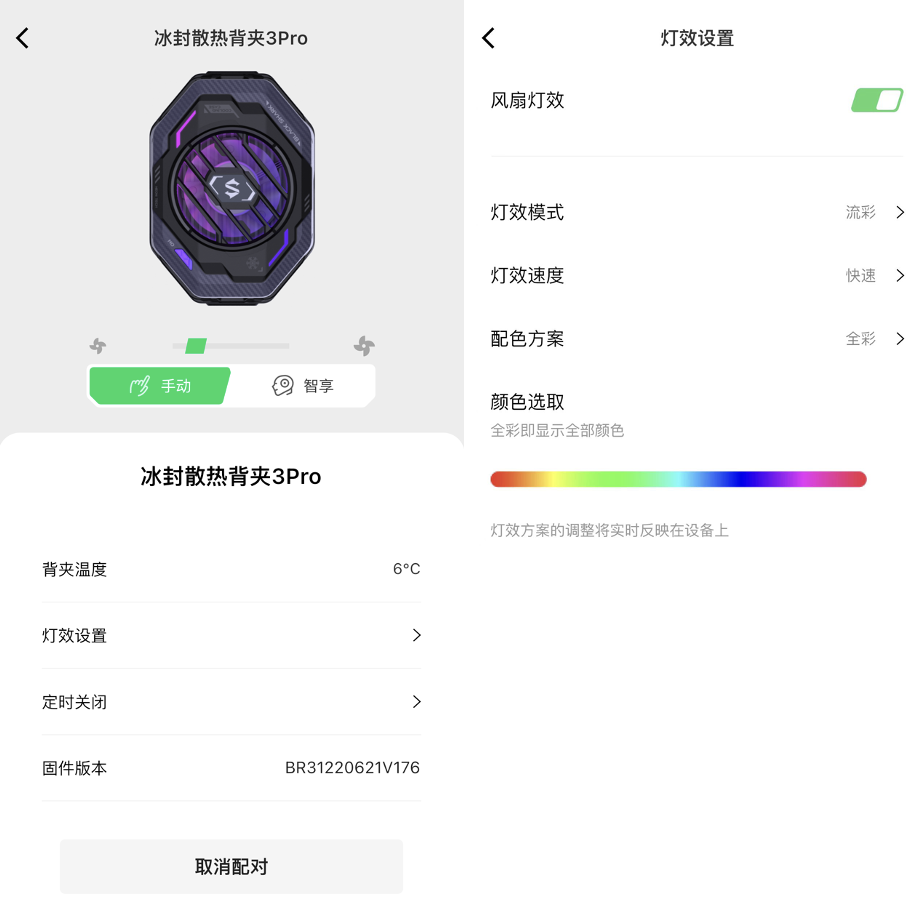 此外,制冷背夾還可設(shè)置專屬燈效,打開“風(fēng)扇燈效”后,即可選擇不同燈效模式,并設(shè)置該模式下的配色 方案、燈效速度和顏色選取。延伸至殼體表面,視覺效果更具沖擊力,為玩家營造更加沉浸的電競(jìng)氛圍感。
