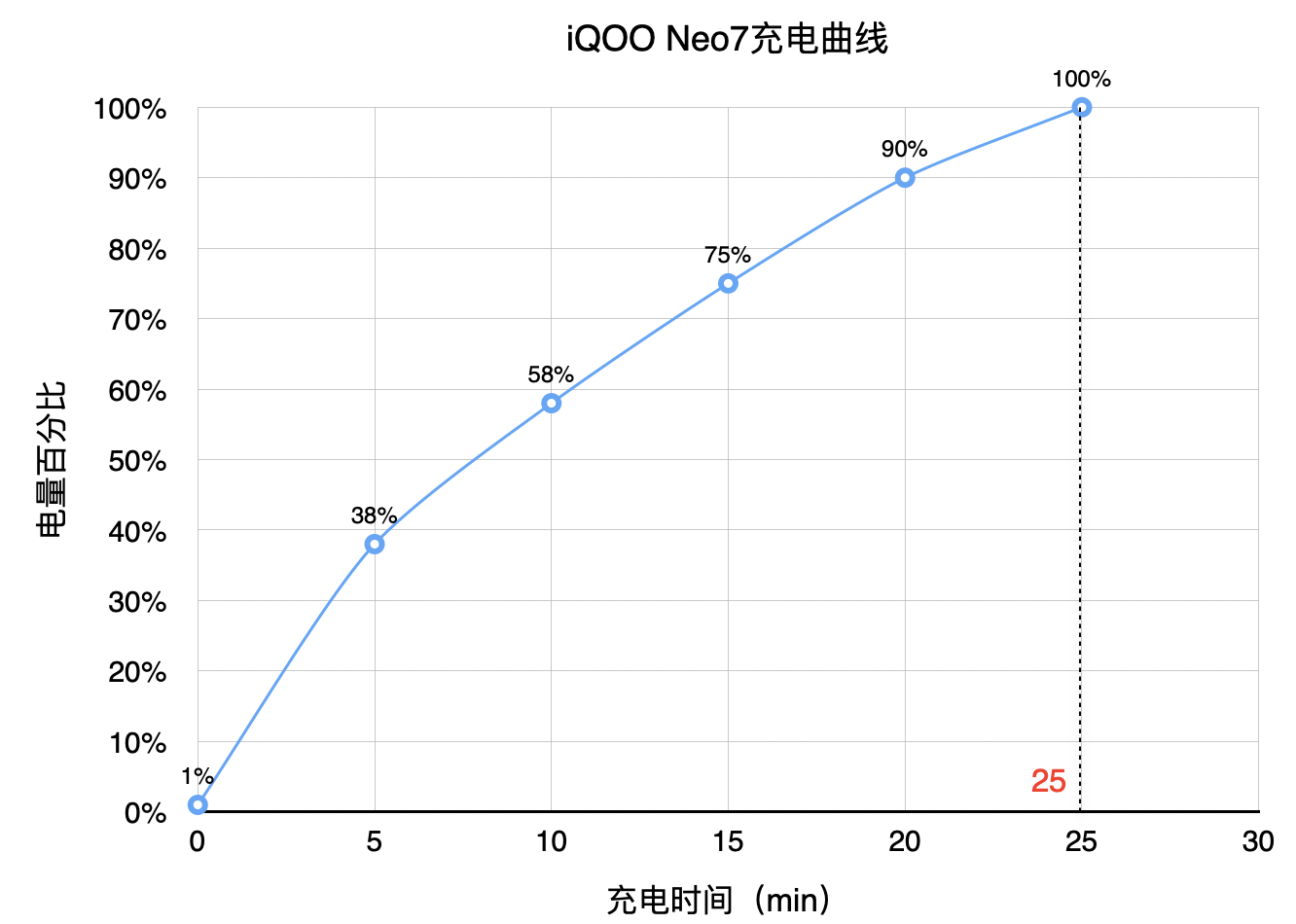 在充電續(xù)航表現(xiàn)上,iQOO Neo7支持雙電芯等效5000mAh的大電池,并支持最高120W的有線快充體驗。實測手機從0%充電到100% 僅需要25分鐘,快速充電+大電池的組合,大大降低了游戲玩家的續(xù)航焦慮。