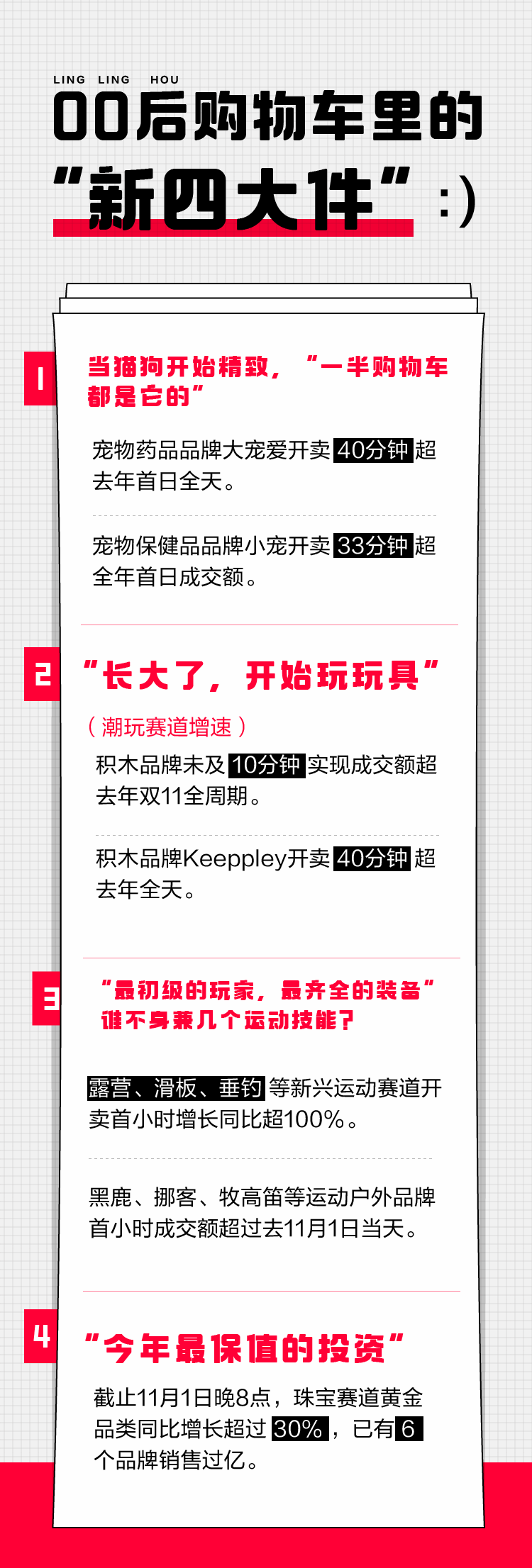整體看下來,這四大行業(yè)并不是剛需,但卻能在今年雙11跑出來,也正應(yīng)和了時(shí)下的消費(fèi)趨勢(shì)——主力消費(fèi)者年輕化,更多提升生活品質(zhì)、滿足精神需求的消費(fèi)在生發(fā)。“悅幾”這個(gè)詞雖然并不新,但在現(xiàn)實(shí)生活中正在以更多新的消費(fèi)趨勢(shì)證明和實(shí)現(xiàn)。“新四大金剛”背后,蘊(yùn)含無數(shù)的藍(lán)海市場(chǎng)和商業(yè)機(jī)會(huì)。