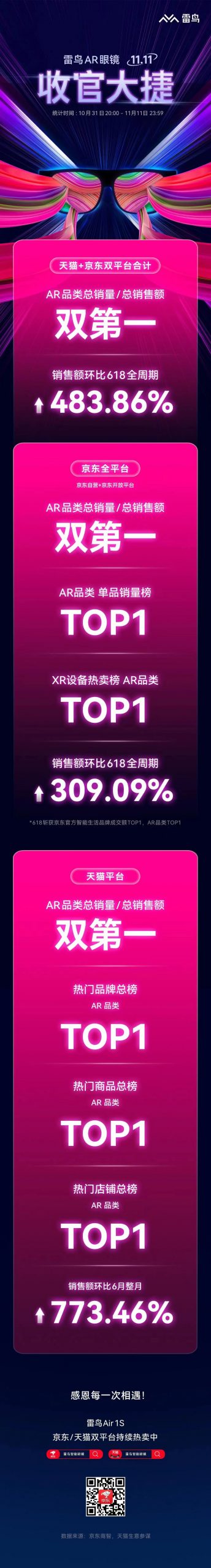 截至11月12日零點,雷鳥創(chuàng)新保持雙平臺全周期銷量、銷售額“雙第一”。天貓官方披露的排名顯示,雷鳥創(chuàng)新為AR品類總銷量/總銷售額雙第一,在 XR 設(shè)備大品類中排名第二,僅次于字節(jié)跳動下的 Pico 品牌。雷鳥創(chuàng)新官方戰(zhàn)報顯示,雷鳥創(chuàng)新為天貓AR品類“熱門品牌總榜”、“熱門商品總榜”、“熱門店鋪總榜”榜單多項第一,銷售額環(huán)比6月整月增長773.46%。