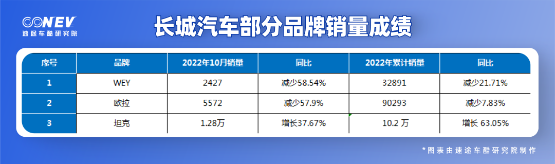 WEY方面,數(shù)據(jù)顯示:WEY品牌10月的銷量只有2427輛,而去年同期則賣出了5854輛,同比減少58.54%。今年1-10月一共賣出32891輛,與去年同期賣出的42012輛相比,同比減少21.71%。