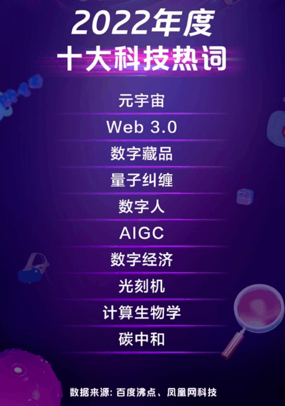 速途元宇宙研究院訊 近日,百度沸點(diǎn)聯(lián)合鳳凰網(wǎng)科技發(fā)布了“2022 年度科技熱詞”,這些熱詞分別是元宇宙、Web 3.0、數(shù)字藏品、量子糾纏、數(shù)字人、AIGC、數(shù)字經(jīng)濟(jì)、光刻機(jī)、計(jì)算生物學(xué)、碳中和。