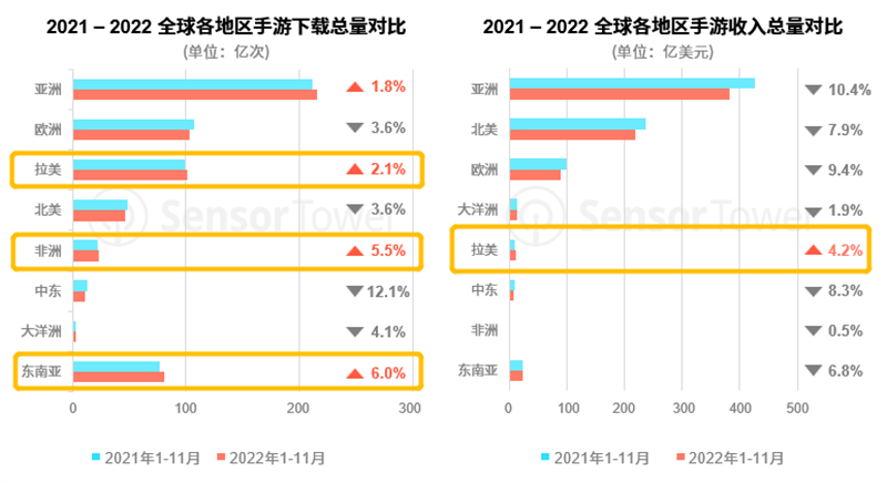 2022年全球移動游戲市場呈“總體下行,局部穩增”的態勢。全球手游市場收入總量同比下滑,是自新冠疫情爆發以來收入表現首次出現明顯下降的一年,大部分手游品類以及區域市場均出現負增長。在下載量層面,2022年總體下載量基本與去年保持持平,盡管歐美成熟市場出現不同程度負增長,但新興市場例如拉美、東南亞和非洲卻展示出樂觀的增長趨勢。