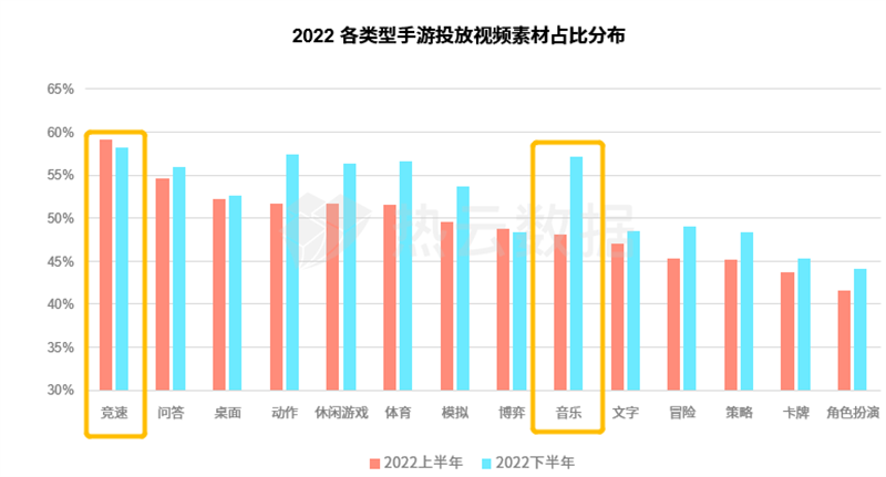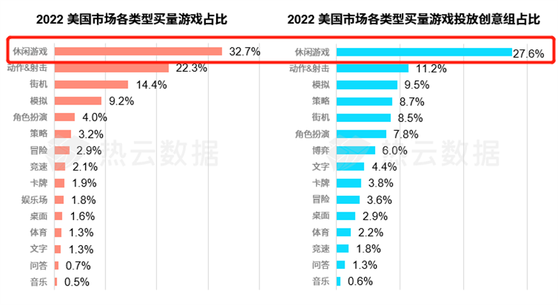 2022下半年,海外新增買量手游占比,雖較上半年下滑降至25%,但該數據仍居近3年的高位。休閑類游戲依舊是全球買量手游類型的 No.1,動作 & 射擊類買量游戲數是今年占比排名上升最快的類型。此外,各類型手游加大視頻廣告投放占比,尤以競速游戲投放視頻廣告的占比領銜全品類,音樂類成為下半年視頻廣告占比提速最快的品類。