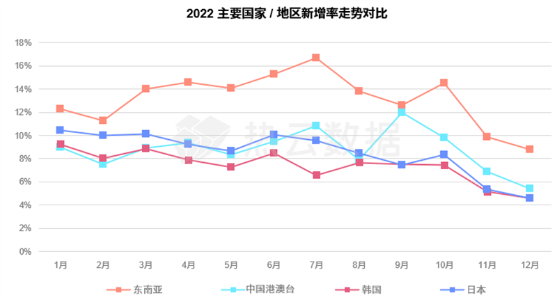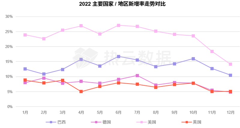 全球各重點買量市場中,全球大部分成熟手游買量市場,于2022下半年的買量手游數量同樣出現有不同程度的下滑;相反東南亞、巴西新興市場則穩中有升,熱度不減。從增量上看,美國依舊是新增買量手游最高的國家;新興市場中的東南亞、巴西同樣表現搶眼。
