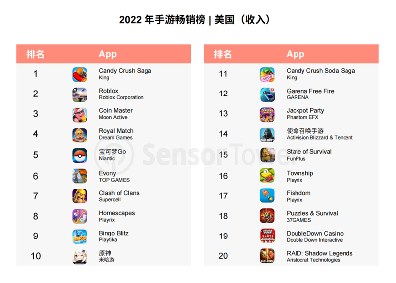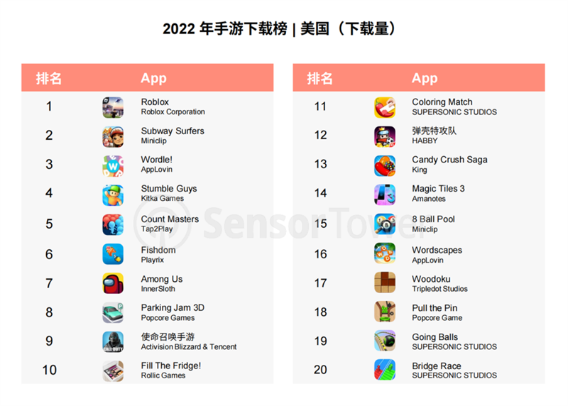 具體而言,以美國市場為例,該國的休閑類手游買量地位仍然牢固排名首位,且在單品的下載量以及收入的表現上依舊突出。 收入層面,經典三消手游《Candy Crush Saga》依靠頻繁的關卡更新維持著穩定的用戶活躍與營收,并在 2022 年超過《Roblox》重登美國暢銷榜榜首。而在 2022 年美國手游下載榜 Top 20 中,共 7 款為超休閑品類,可見該品類巨大的市場潛力。