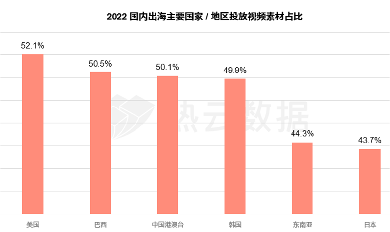 美國依然國內手游出海買量游戲數量最高的國家;中國港澳臺地區憑借地緣優勢,今年新增出海買量游戲比例最高。此外,投放視頻廣告同樣成為國內出海廠商的主流買量方式。美國成為我國出海買量游戲投放視頻素材最高的國家,巴西、港澳臺地區的視頻廣告投放數量均超半數。