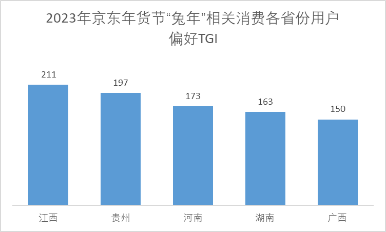 從用戶參與購買“兔年”相關(guān)商品的熱情程度來看,江西、貴州、河南、湖南和廣西的用戶的生肖消費(fèi)偏好度全國排名最高。