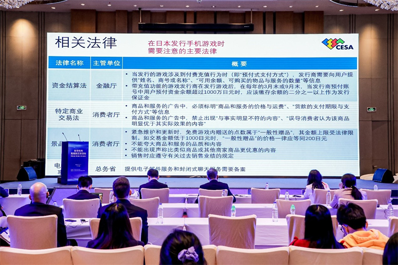 日本計算機娛樂供應商協會的常務理事山地康之先生通過視頻連線的方式就日本發行手游要注意的相關法律事項對現場的嘉賓進行了分享。首先是資金結算法,在游戲當中發行貨幣進行付費充值的這些行為,也就是說要使用預付支付方式,使用這種方式,發行商需要向用戶提供姓名、商號或者名稱,以及可用余額,可購買的物品以及服務數量等信息。