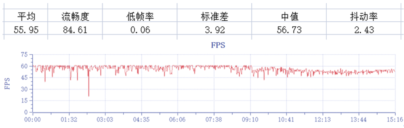 在游戲測試環(huán)節(jié),我們選擇了負(fù)載更高的《原神》進行測試,先在手機設(shè)置中開啟“高性能”模式,再在游戲中心開啟“電競模式”,再在游戲畫質(zhì)設(shè)置中,首先將圖像質(zhì)量設(shè)置為“極高”,并手動將最大幀率設(shè)置為“60幀”。測試路線為須彌城跑圖。在15分鐘的測試中,一加Ace 2V能夠保持平均幀率在55.95幀,畫面并未出現(xiàn)明顯的幀率波動。