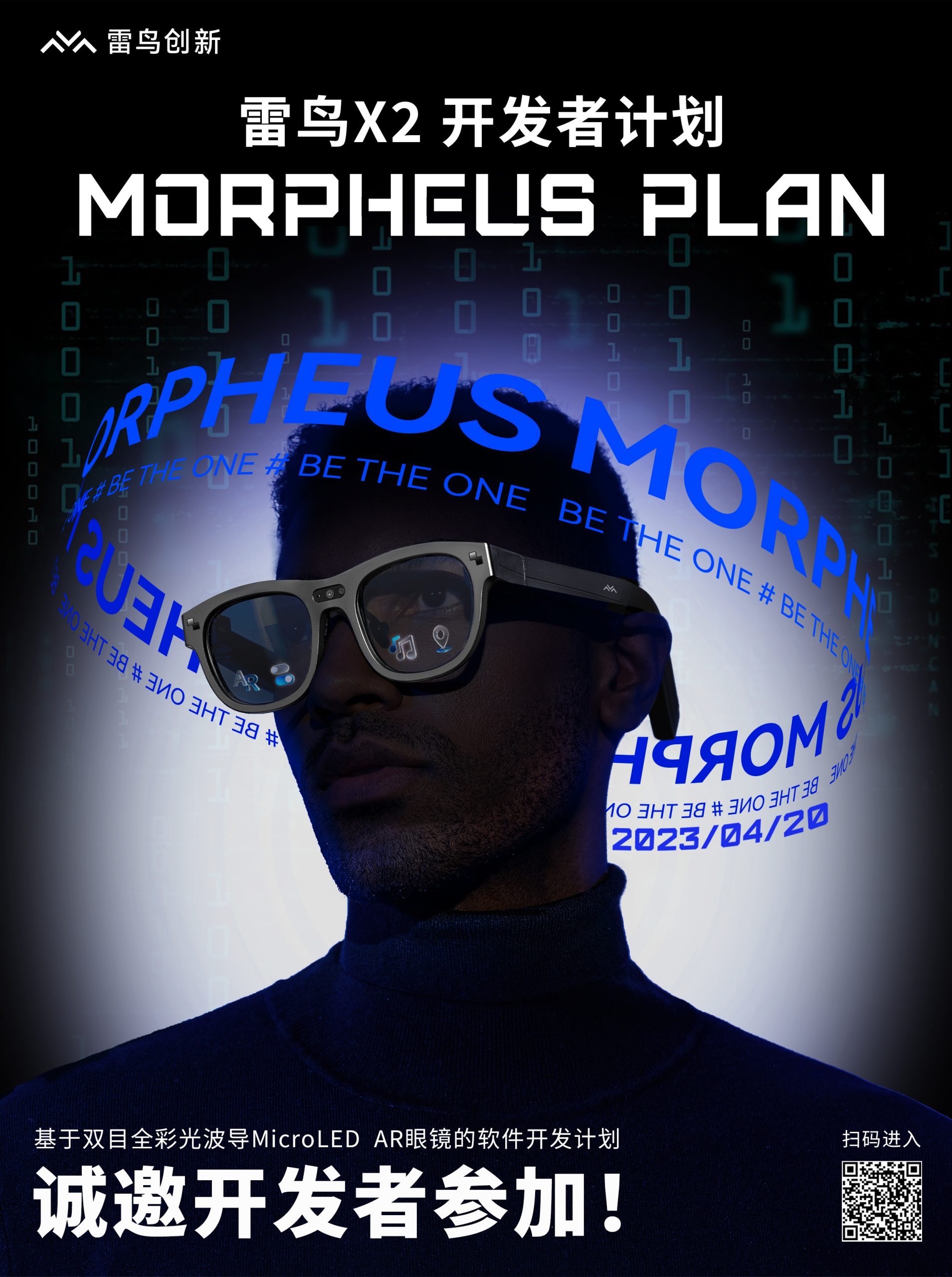 速途網4月20日消息(報道:李楠)今日,雷鳥創新發布全球AR應用開發者計劃“Morpheus Plan”, 邀請全球AR應用開發者一起,發揮奇思妙想,共同建設和繁榮AR生態。該計劃以消費級真AR眼鏡雷鳥X2為硬件載體,是全球首個基于雙目全彩MicroLED光波導 AR眼鏡的軟件開發計劃。