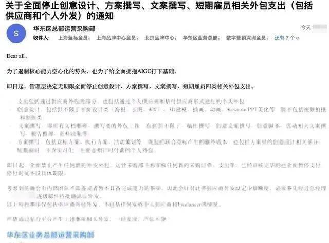 無獨有偶,在傳媒行業中,近期在網上瘋傳的一張截圖,截圖曝光的內容是藍色光標,其華東區總部運營采購部發布通知,為全面擁抱AIGC,管理層決定即日起無限期全面停止創意設計、方案撰寫、文案撰寫、短期雇員四類相關外包支出。
