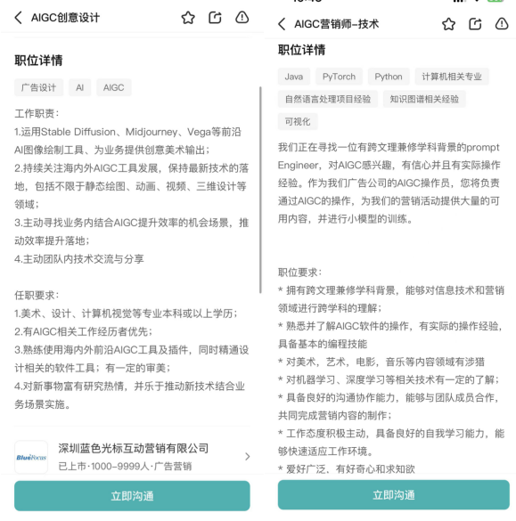 不過,速途元宇宙研究院認為,AI替代一些崗位也勢必會帶來一些新的機遇。就目前而言,以藍色光標為例,在招聘平臺上,新增設置AI繪畫師、AI原畫、AI產品經理、AIGC營銷師、AIGC操作員、AIGC創意設計等崗位。