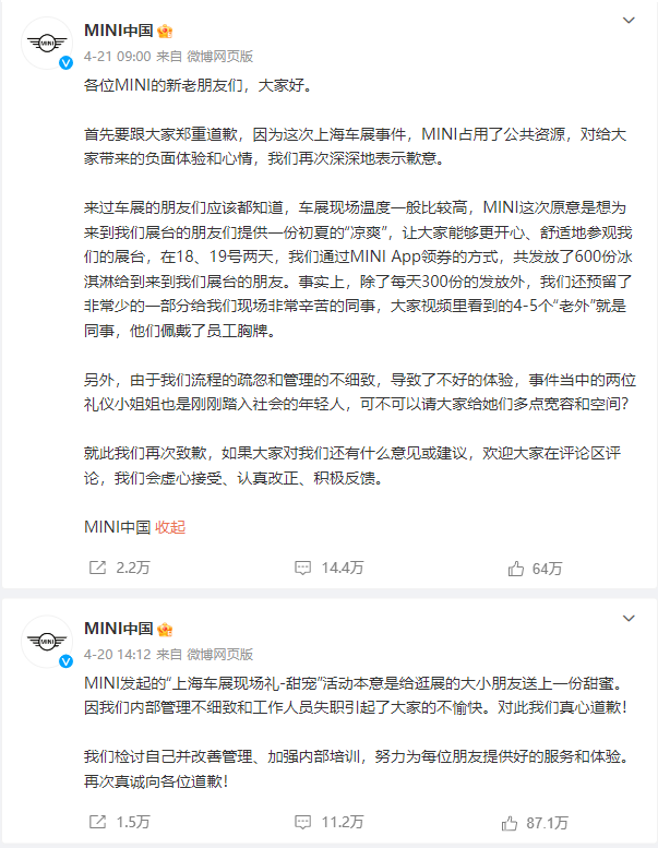 對此,寶馬MINI分別于4月20日和4月21日連發兩篇道歉信,稱會加強內部管理培訓,但輿論仍在發酵。21日又發表一篇道歉信稱領到冰激凌的外籍人士系公司員工,并不是只給外國人。對這兩篇道歉信有超過14萬條評論,網友熱評“AI都比你會寫”。