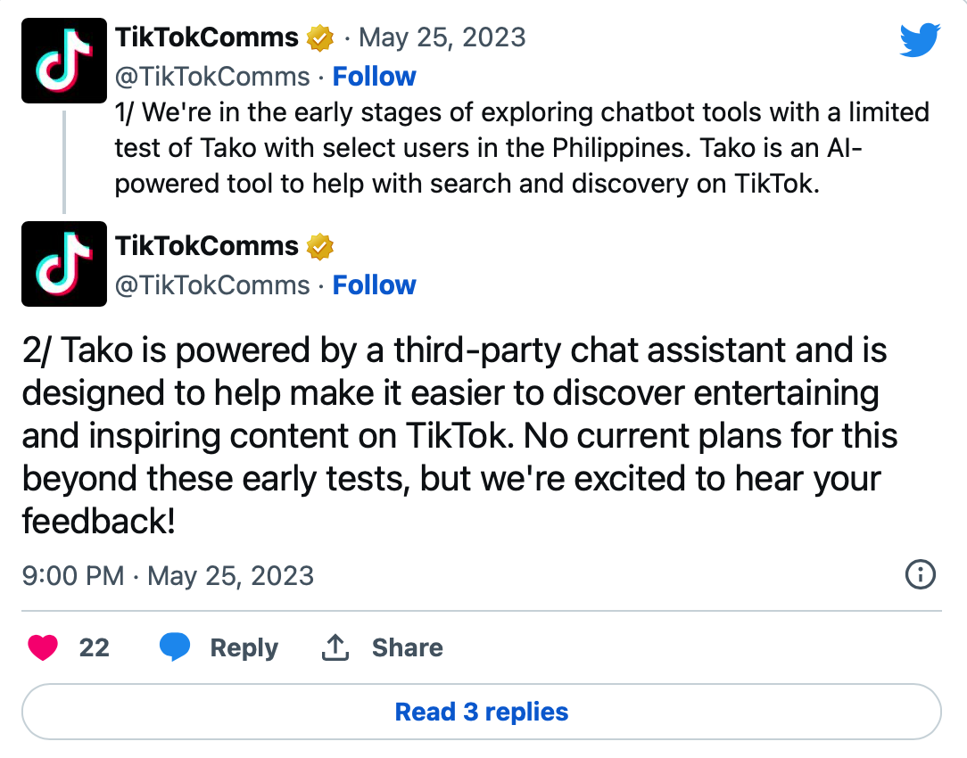 當地時間5月25日,TikTok也通過推特證實他們正在進行有限的Tako測試,表示: Tako是一種人工智能驅動的工具,可以幫助用戶在TikTok上進行搜索和發現。公司正處于聊天機器人工具探索的早期階段,正在與菲律賓的精選用戶進行有限的Tako測試。