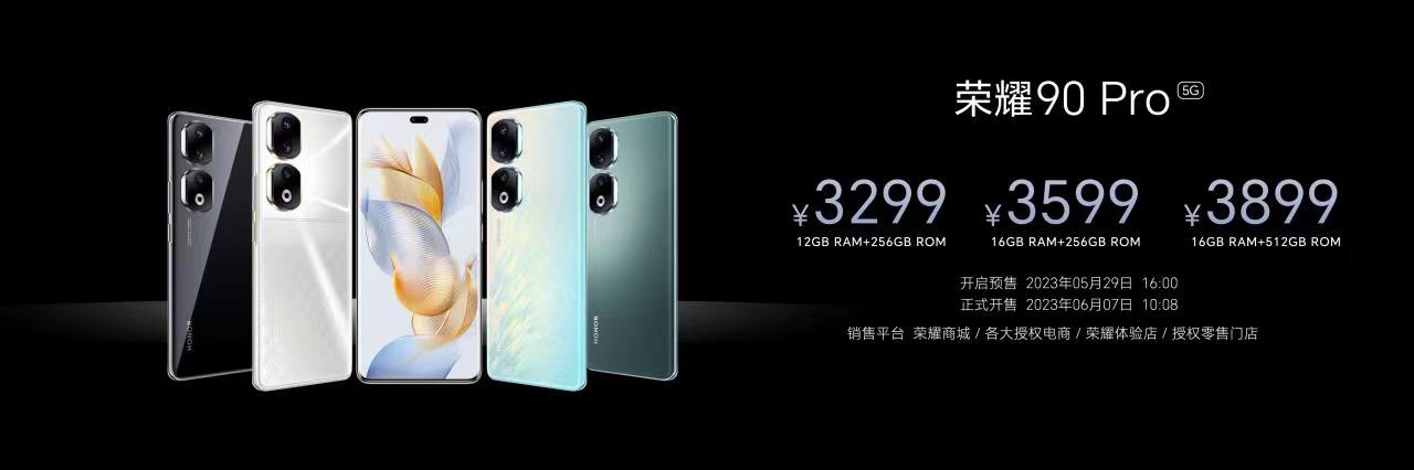 榮耀90 Pro 12GB RAM+256GB ROM版本售價3299元;榮耀90 Pro 16GB RAM+256GB ROM版本售價3599元;榮耀90 Pro 16GB RAM +512GB ROM版本售價3899元。