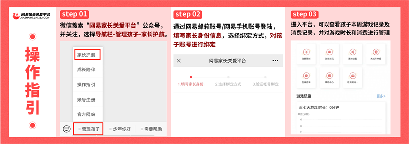 “網(wǎng)易家長(zhǎng)關(guān)愛(ài)平臺(tái)”是網(wǎng)易游戲?yàn)楦咝椭议L(zhǎng)解決未成年游戲相關(guān)各類問(wèn)題、科學(xué)管理未成年游戲行為而專設(shè)的平臺(tái)。家長(zhǎng)可通過(guò)微信搜索公眾號(hào)“網(wǎng)易家長(zhǎng)關(guān)愛(ài)平臺(tái)”,或在游戲官網(wǎng)、登錄界面直接點(diǎn)擊“家長(zhǎng)關(guān)愛(ài)平臺(tái)”按鈕,即可登錄平臺(tái)操作,能夠隨時(shí)隨地通過(guò)手機(jī)查詢和管理孩子的游戲時(shí)間和消費(fèi)情況,可以設(shè)置游戲禁玩、禁止消費(fèi),對(duì)孩子的游戲情況和行為直觀掌控;當(dāng)遇到防沉迷、未成年騷擾、未成年詐騙等相關(guān)問(wèn)題,也可以通過(guò)平臺(tái)咨詢投訴、尋求幫助。截至目前,網(wǎng)易家長(zhǎng)關(guān)愛(ài)平臺(tái)已累計(jì)幫助超過(guò)10萬(wàn)家長(zhǎng)解決了孩子消費(fèi)異常、時(shí)間管理、退款等問(wèn)題。平臺(tái)還邀請(qǐng)了教育專家入駐,為家長(zhǎng)與孩子的溝通教育提供更多建設(shè)性思路。