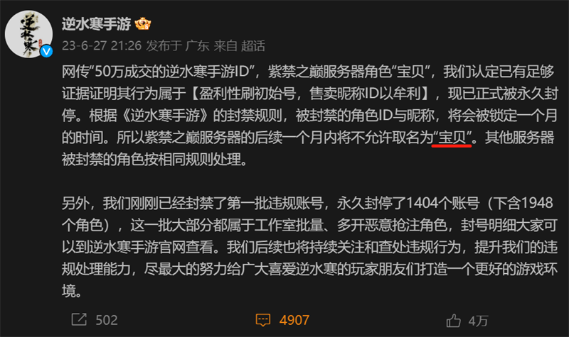 開服前的預體驗階段,部分工作室搶注ID并天價拋售,部分ID如“寶貝”被炒到50元天價,官方也立即對工作室進行果斷封殺,游戲開服前就封禁了超過1000個違規賬號,一個月不讓叫“寶貝”也變成核心玩家之間流傳的讓人捧腹大笑的梗;
