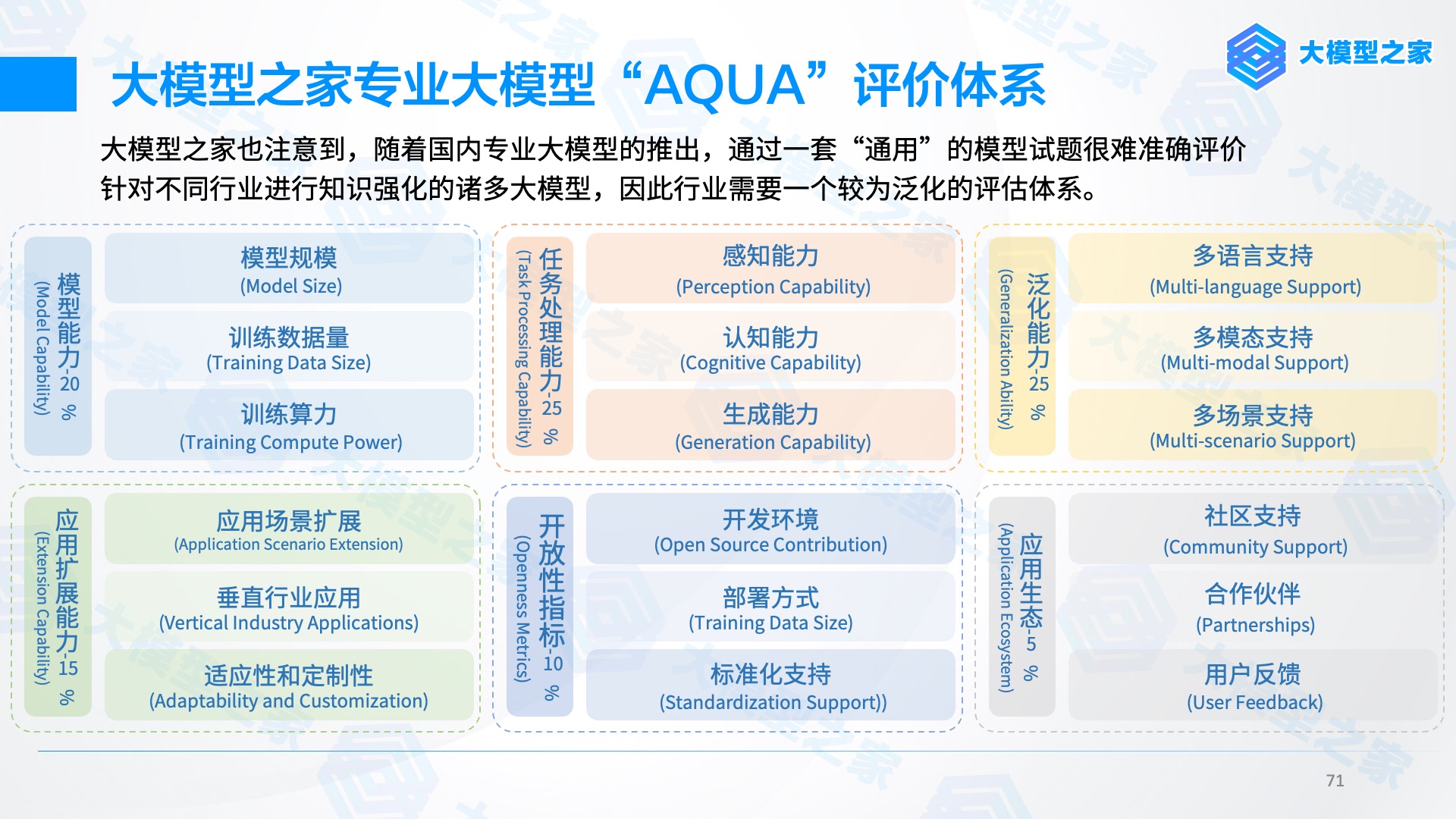 此外,《報告》特別提出專業大模型“AQUA”評價體系,從6項指標,18個維度形成對人工智能大模型的全方位,立體式的評估標準,用以幫助使用者選擇更適用的大模型。