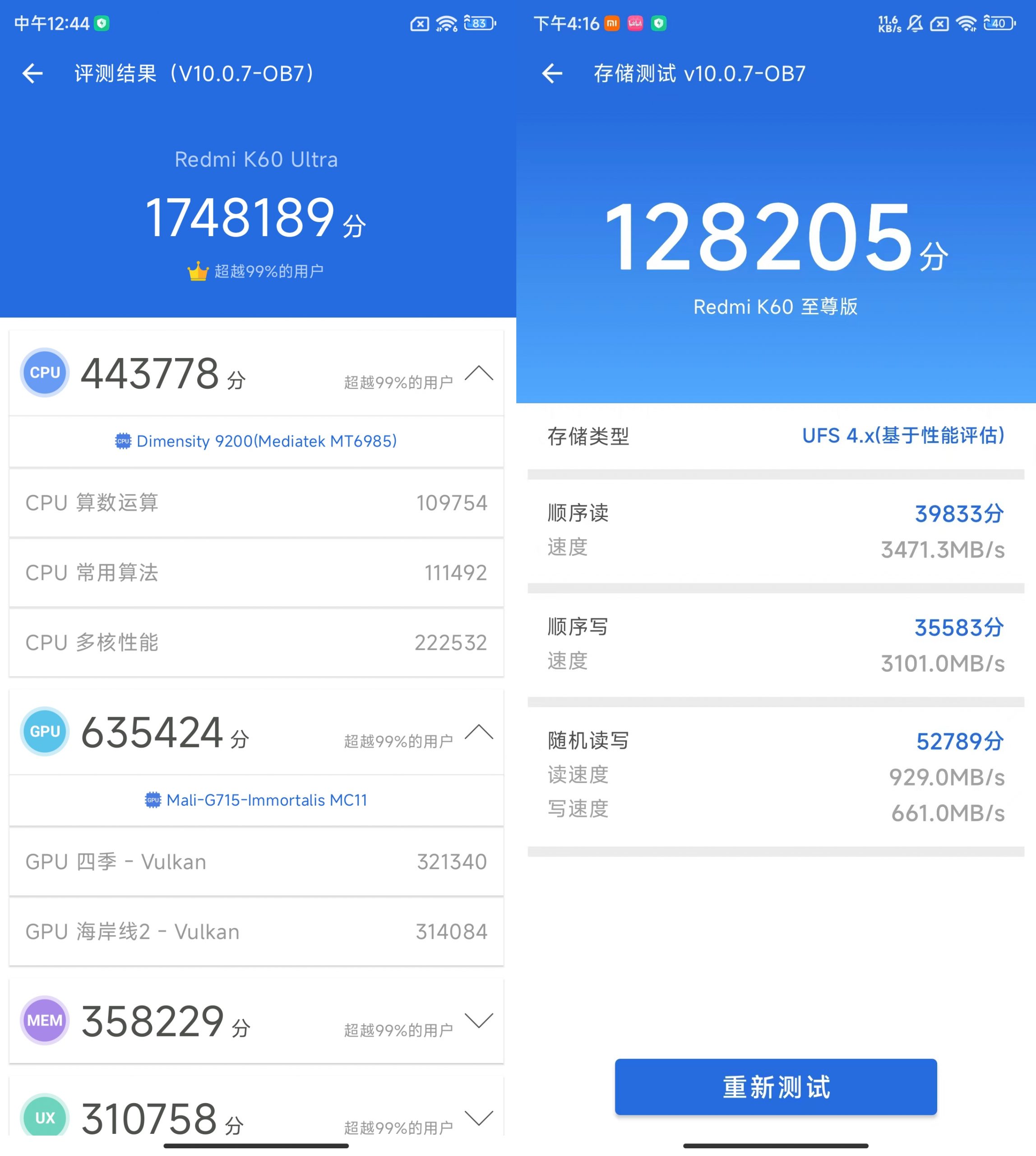 核心性能方面,Redmi K60 至尊版搭載了聯發科天璣9200+的芯片,這顆芯片采用臺積電4nm制程工藝,CPU與GPU相較于天璣9200都有一定的超頻。CPU方面,天璣9200+配備1個3.35GHz的 Cortex-X3 超大核、3個3.0GHz的A715大核、以及4個2.0GHz的A510小核;GPU方面則是 Immortalis-G715核心,頻率從981MHz提升到了1150MHz。同時,Redmi K60 至尊版還搭載了最高24GB LPDDR5X運存,以及最高1TB的UFS4.0閃存,讓用戶徹底告別“內存焦慮”。