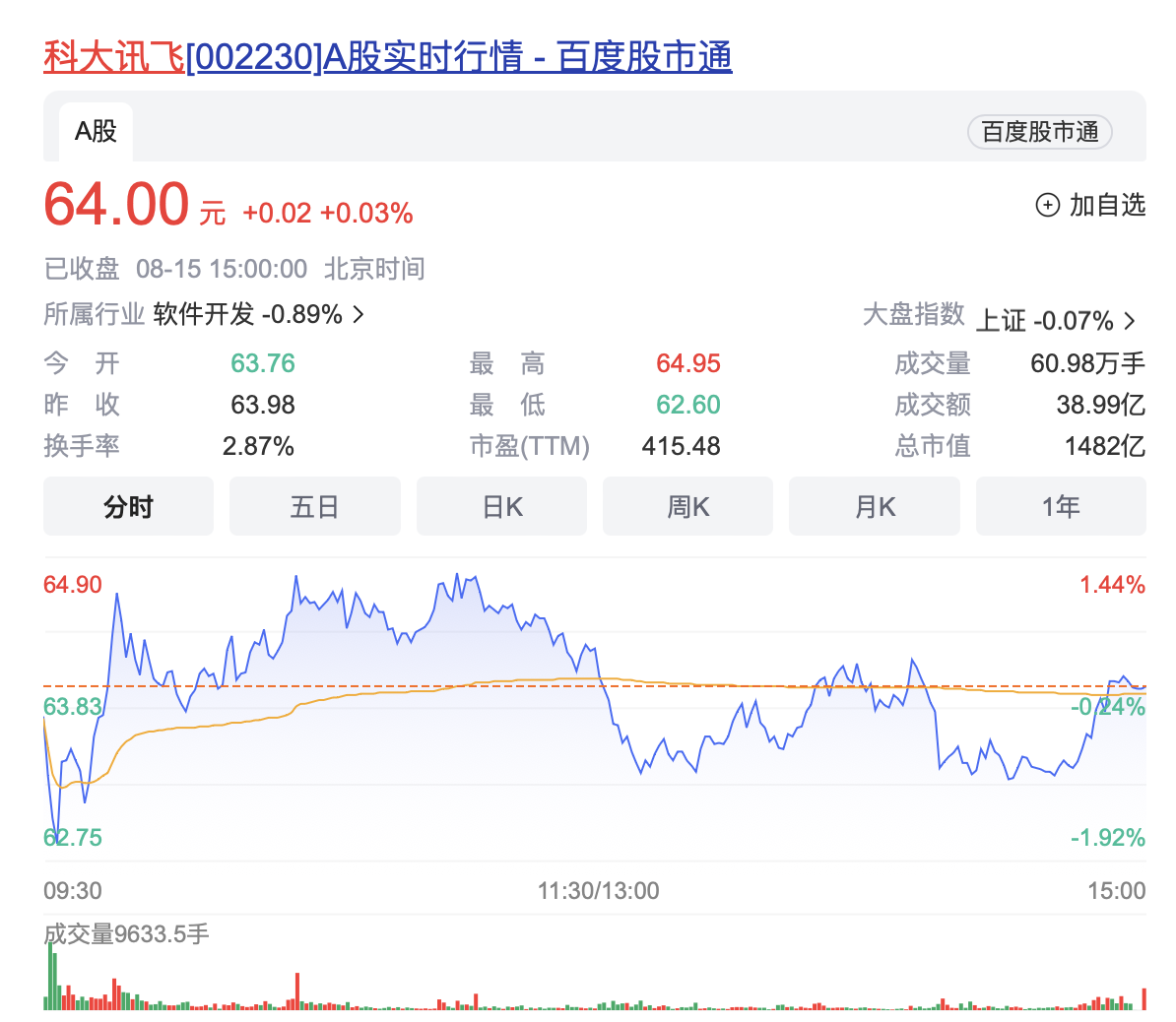 截至15日收盤,科大訊飛股價(jià)為64.00元,上漲0.03%,可見減持并沒有給訊飛星火認(rèn)知大模型V2.0的發(fā)布帶來不利影響,也不能熄滅大模型行業(yè)的熱情。