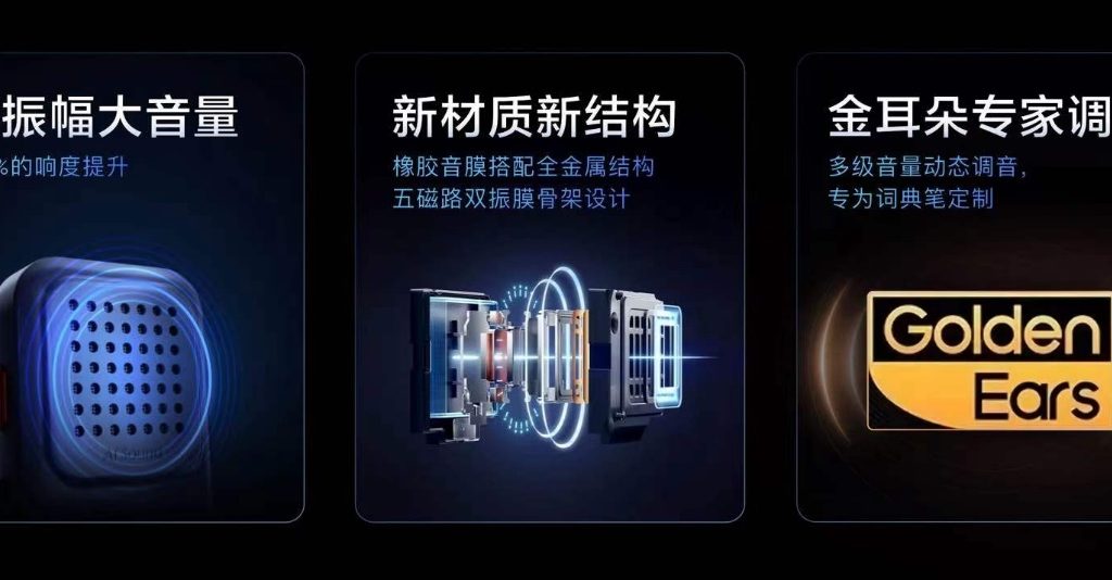 發(fā)布會上,網(wǎng)易有道高級副總裁、智能硬件業(yè)務(wù)負(fù)責(zé)人吳迎暉表示,音質(zhì)是用戶普遍關(guān)注的方面,有道與瑞聲科技聯(lián)合開發(fā),為有道詞典筆 X6 Pro 配備了一顆全新材質(zhì)和結(jié)構(gòu)的揚(yáng)聲器,并且在詞典筆領(lǐng)域中首次與金耳朵專家聯(lián)合調(diào)校,定制出了殿堂級音質(zhì)的詞典筆,可媲美旗艦級手機(jī)和音箱。
