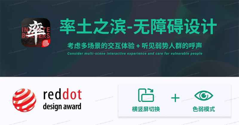 除了參與者眾多、競爭激烈外,獎項的評選標(biāo)準(zhǔn)也是極為苛刻,以紅點品牌與傳達設(shè)計大獎為例,就包括了獨創(chuàng)性與創(chuàng)意性、設(shè)計質(zhì)量與創(chuàng)新、可理解性與情感表現(xiàn)等多維度的評判標(biāo)準(zhǔn)。能夠獲得這個獎項,驗證了《率土之濱-無障礙設(shè)計》在這些方面的出色表現(xiàn)。
