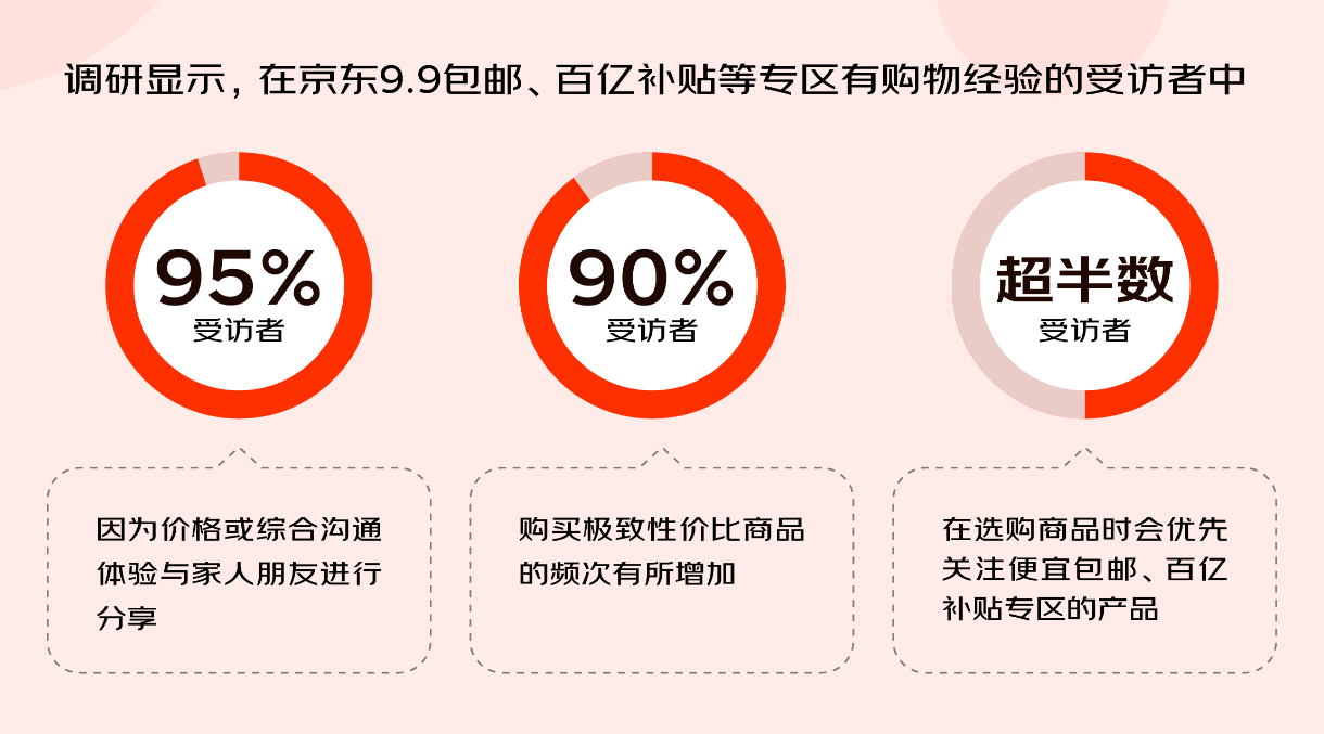 此外,極致性價比產品的口碑效應明顯,大量消費者愿意向家人朋友等分享在京東購買的產品。調研顯示,在京東9.9包郵、百億補貼等專區有購物經驗的受訪者中,有95%的受訪者會因為價格或綜合溝通體驗與家人朋友進行分享,且有近90%的受訪者購買極致性價比商品的頻次有所增加。