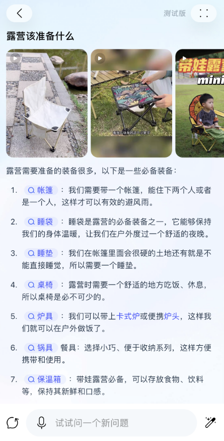 首先,大模型之家選擇體驗(yàn)了資深導(dǎo)購員版塊下的推薦問題:“露營該準(zhǔn)備什么”?大約30秒,淘寶問問便給出了答案。答案之外,其不僅對(duì)所需物品的用處進(jìn)行了闡釋,還推送了相關(guān)所需產(chǎn)品的“購買鏈接”,用戶只需點(diǎn)擊便可直接進(jìn)入淘寶店鋪。可以說,無論是回答的完整性、應(yīng)用場(chǎng)景及推薦的相關(guān)性,還是產(chǎn)品存在的“必需性”,淘寶問問表現(xiàn)的都十分可圈可點(diǎn)。
