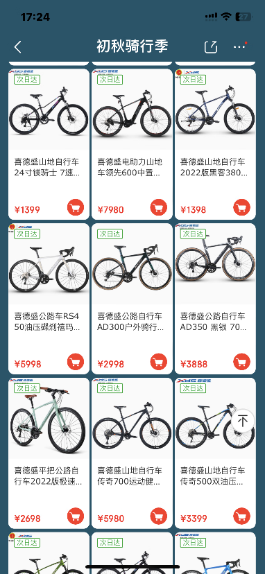 本次騎行節中,京東到家聯合喜德盛為消費者帶來公路車、青少年山地車、電助力自行車等豐富多樣的車型,滿足消費者不同騎行場景的需求。此外,更有騎行頭盔、騎行服、騎行水壺、騎行手套等多種騎行裝備,活動期間以豐富的高性價比商品,為消費者提供高品質、多元化、實惠的騎行消費選擇。
